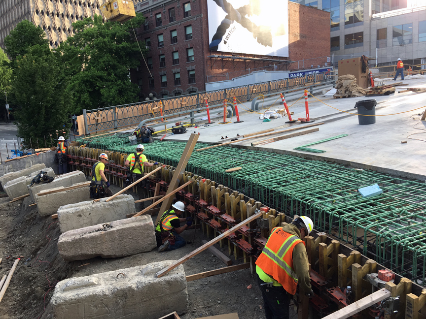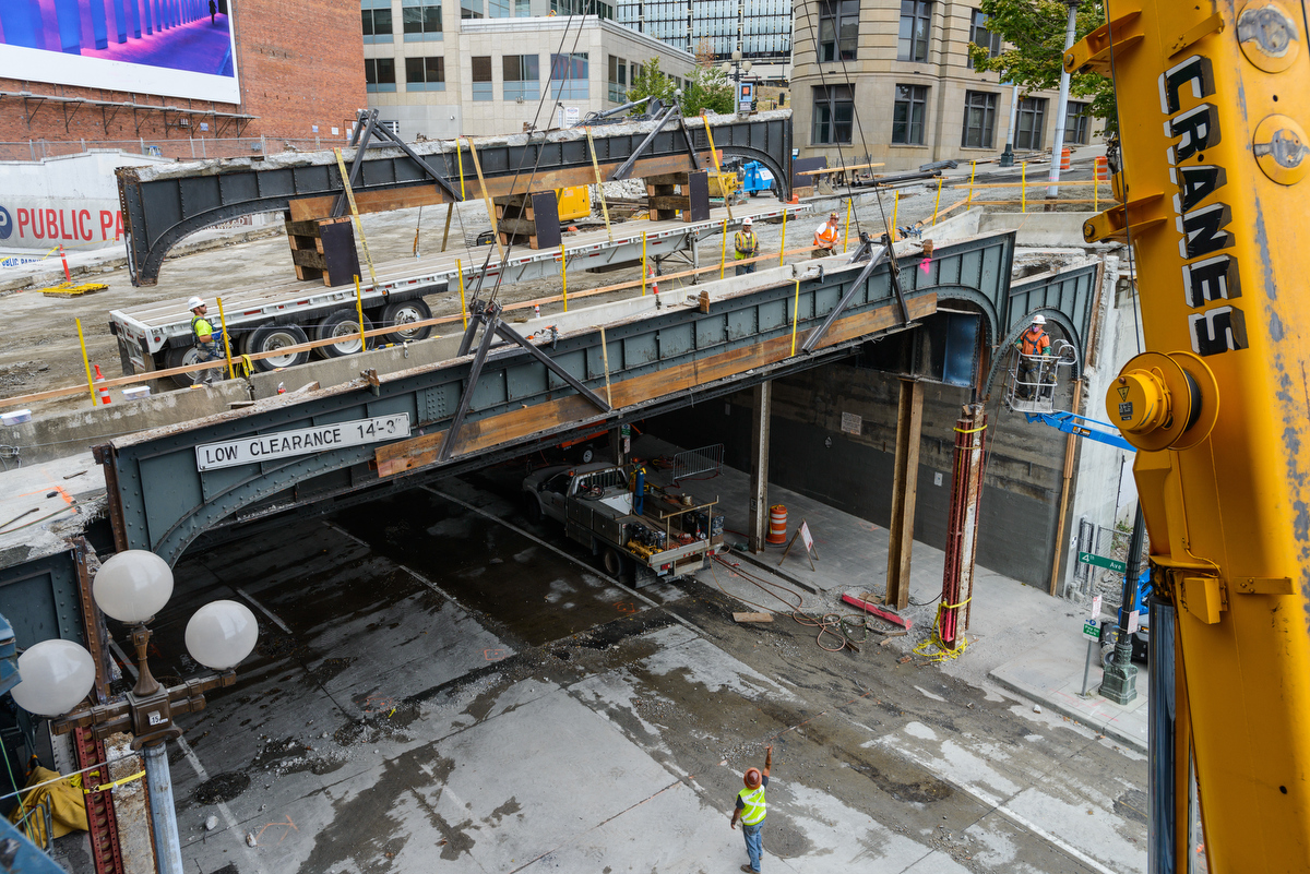 IMCO Construction rebuilt the historic Yesler Bridge in downtown Seattle, removing the existing bridge and constructing a new pier foundation and abutment that supports the lateral pressure of the arch at the end of the bridge. IMCO crews performed rehabilitation of the existing abutment and historical elements, building a new steel girder bridge, and making improvements to sidewalks, roadway surfaces, and existing railings for improved pedestrian and traffic safety. Historical elements such as decorative pedestrian railings, fascia girders, ornamental corbels, girder columns and cladding, were carefully removed, rehabilitated, and re-incorporated into the new construction to ensure the key historical features of the bridge were preserved.