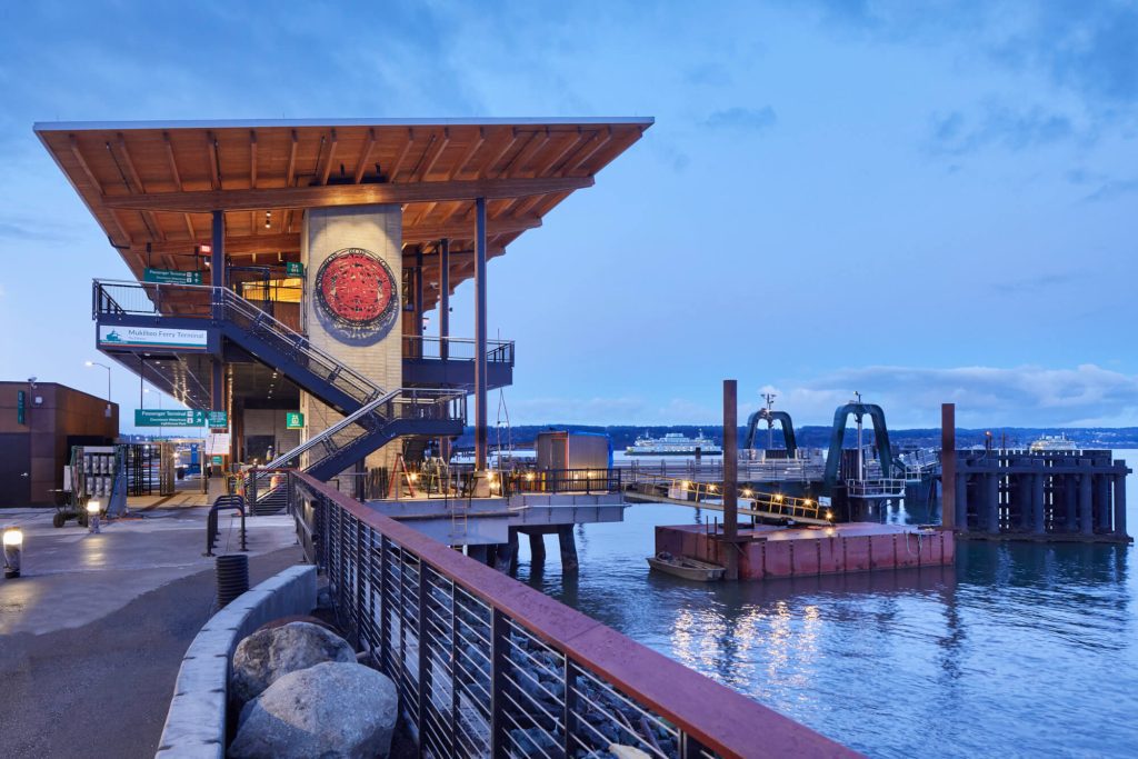 The design team was led by LMN Architects and KPFF Consulting Engineers. The centerpiece of the project is its two-story passenger building with elements of a longhouse in a 30-by-100-foot footprint. It is clad in cedar siding and has large glass windows facing Puget Sound that also channel daylight into the space….