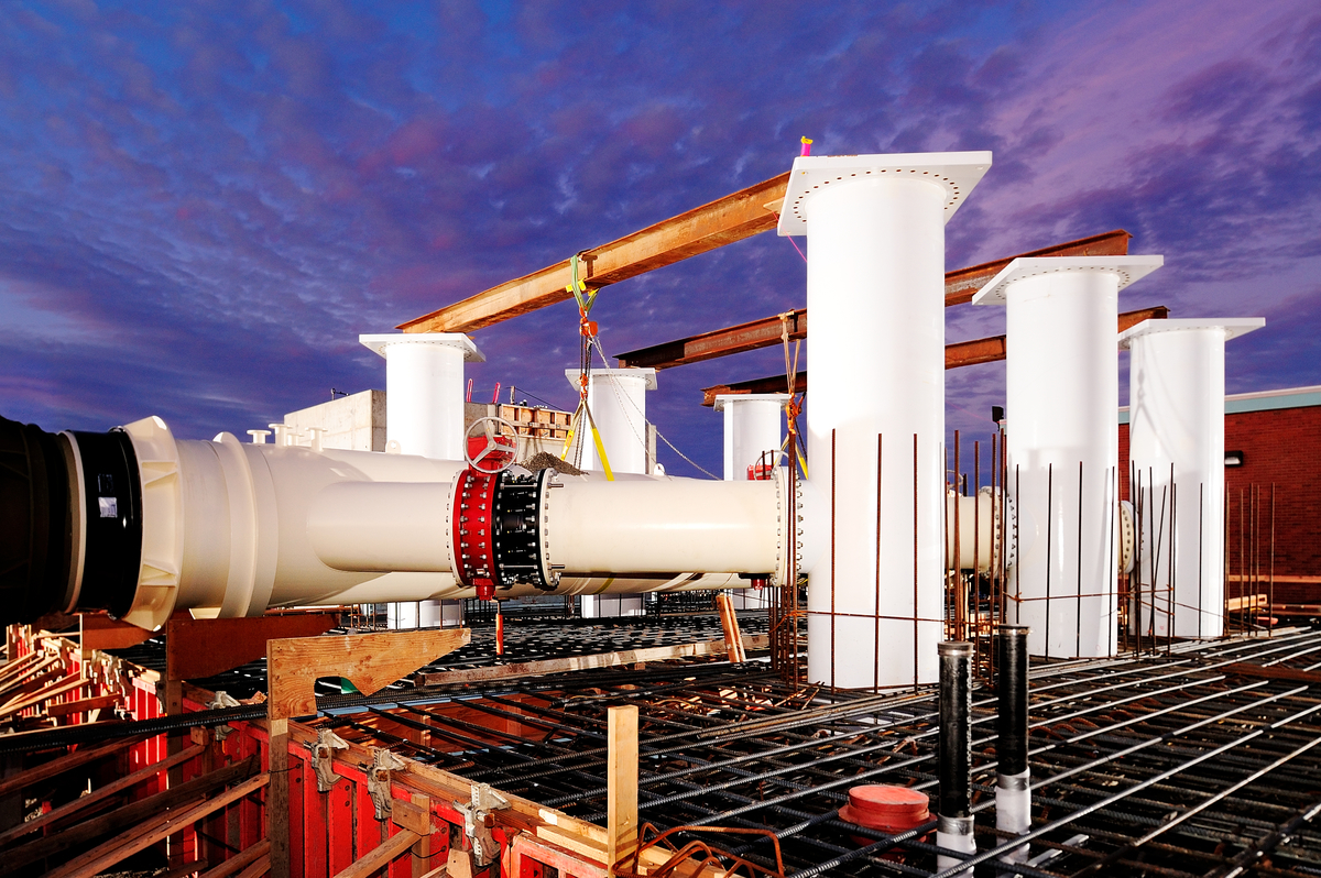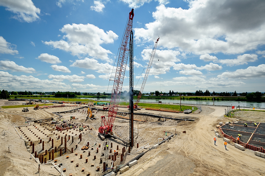 This project constructed a new 42 million gallon per day water treatment plant for the City of Anacortes. The new treatment facility treats water from the Skagit River and serves the 56,000 customers in the City of Anacortes, La Conner, nearby Whidbey Island, and two oil refineries on Fidalgo Island. The project increased capacity, reliability, and water quality with a new pretreatment facility, filter facility, pump stations, operations and control center, chemical facility, clear well, and electrical upgrades. Construction occurred at the site of the existing treatment plant facility and included a new 2.1 million-gallon water storage tank. IMCO Construction self-performed critical construction activities including piping tie-ins to the existing plant within very small working windows to limit the impact to the existing plant, temporary dewatering system capable of pumping 15 MGD, and pile driving 360 steel pipe piles, each 100-feet in length. IMCO placed 14,000 cubic yards or structural concrete for tanks and buildings and installed all yard piping including 54-inch ductile iron and 48-inch welded steel pipe systems. IMCO crews installed all mechanical process systems and piping, five 1,000-horse power high lift turbine pumps, generators for temporary power. IMCO designed and installed the fuel system to run generators for seven consecutive days.