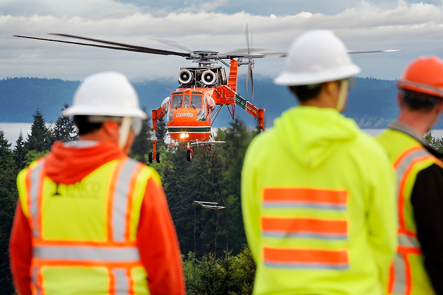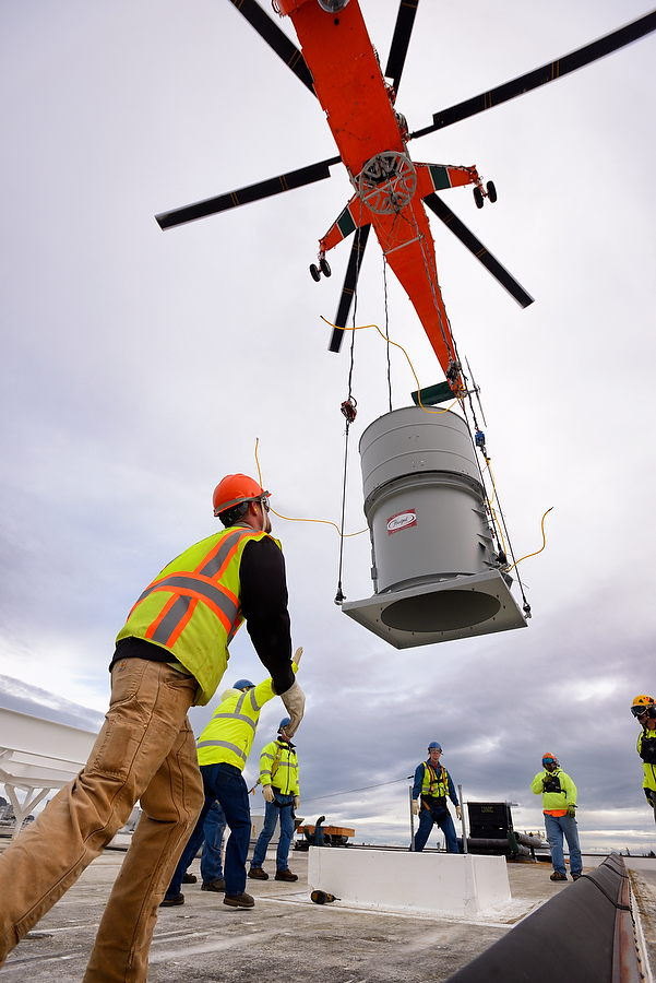 Removal and installation of the cooling towers by helicopter involved extensive coordination with Boeing and required the shutdown of nearly the entire building to meet FAA safety requirements.