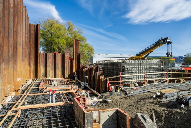 This project provides improvements to the existing lift station and force main pipes to provide adequate pumping capacity to facilitate future sewage conveyance at the Roeder Lift Station. The improvements consist of construction of a new sanitary sewer lift station, associated structures, storm sewer, gravity sanitary sewer, force main sanitary sewer, water main, site and street restoration, erosion control, traffic control, and demolition of portions of the existing lift station. To execute this contract, IMCO Construction crews installed a sheet pile wall next to the railway and a cell to protect the 30-foot-deep structure. The team then poured-concrete building walls, which are 40 inches thick. Work is taking place along a busy Bellingham waterfront roadway, making traffic control critical.