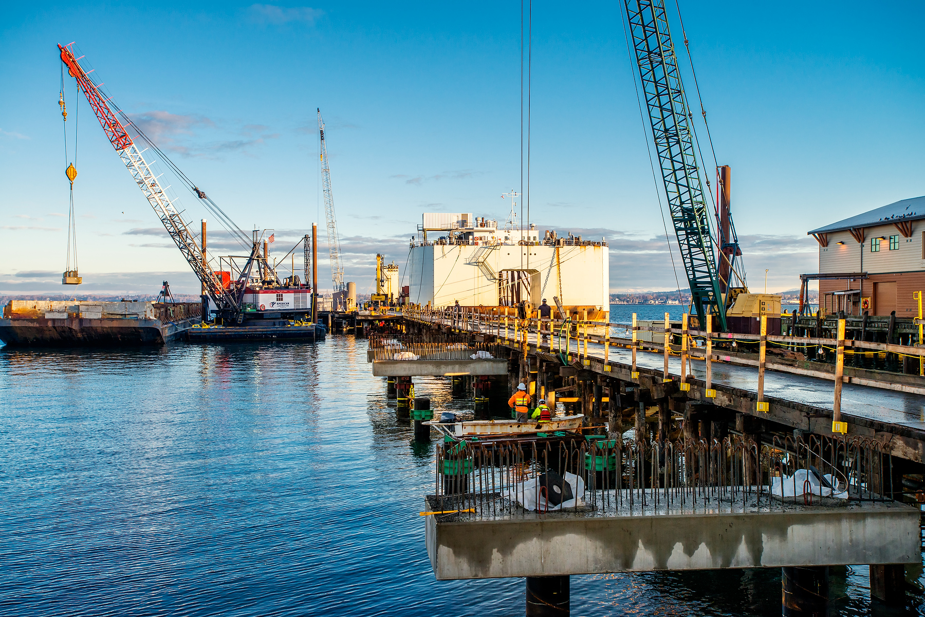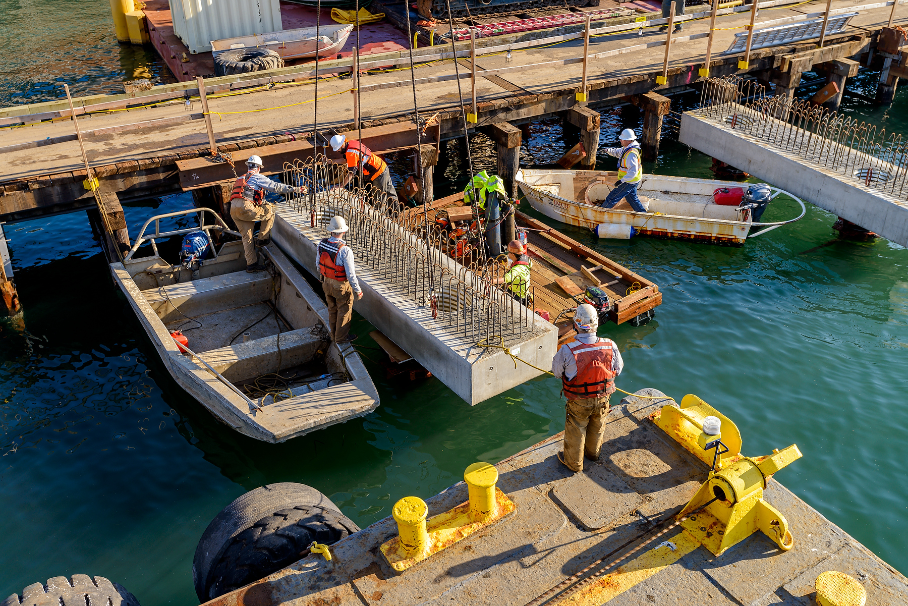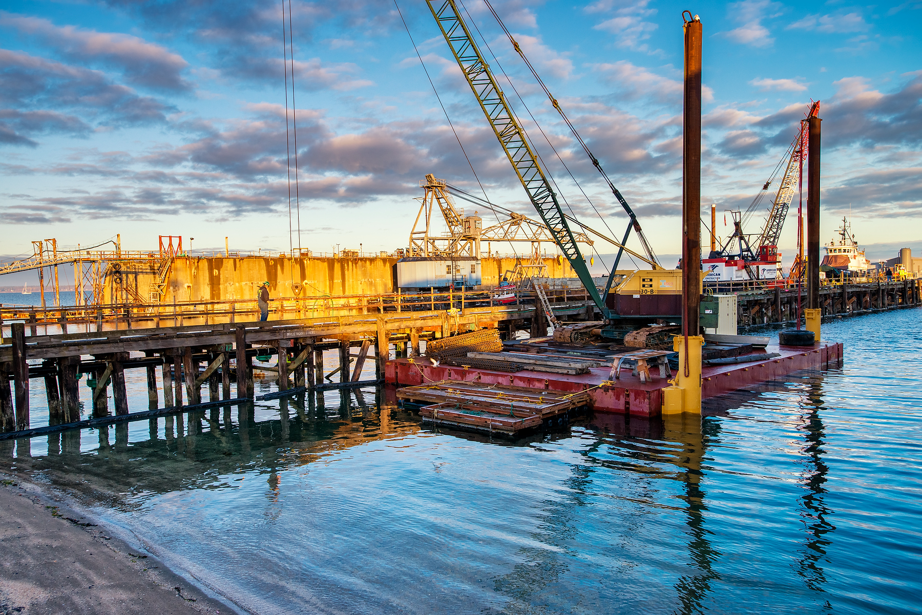 IMCO was awarded this contract in March 2017 to dredge and make infrastructure improvements around the Fairhaven Shipyard property near the Bellingham Cruise Terminal on Harris Avenue in Bellingham, Washington.About half of the cleanup project was funded through the Model Toxics Control Act, which was funded through a tax on hazardous substances, including oil. The project cleanup and construction work had to stop at different times of the year in order to protect marine life in the area. Crews worked in the middle of the working shipyard to remove a 10,000-square-foot building that was situated over the water. The contract included the removal of contaminated sediment, and replacement of the wooden portion of the pier with concrete. The new shipyard pier was constructed with steel pilings and a concrete deck, matching the section of the pier that was constructed in the 1990’s.