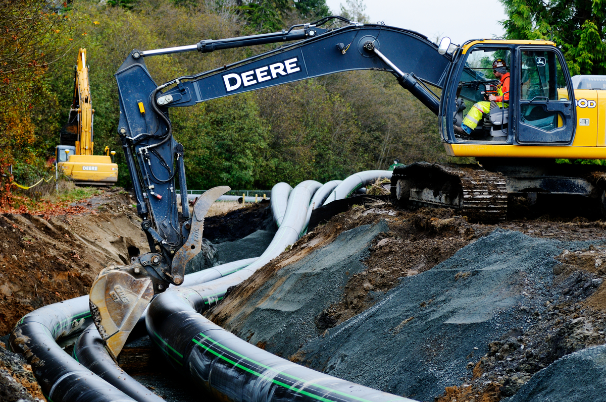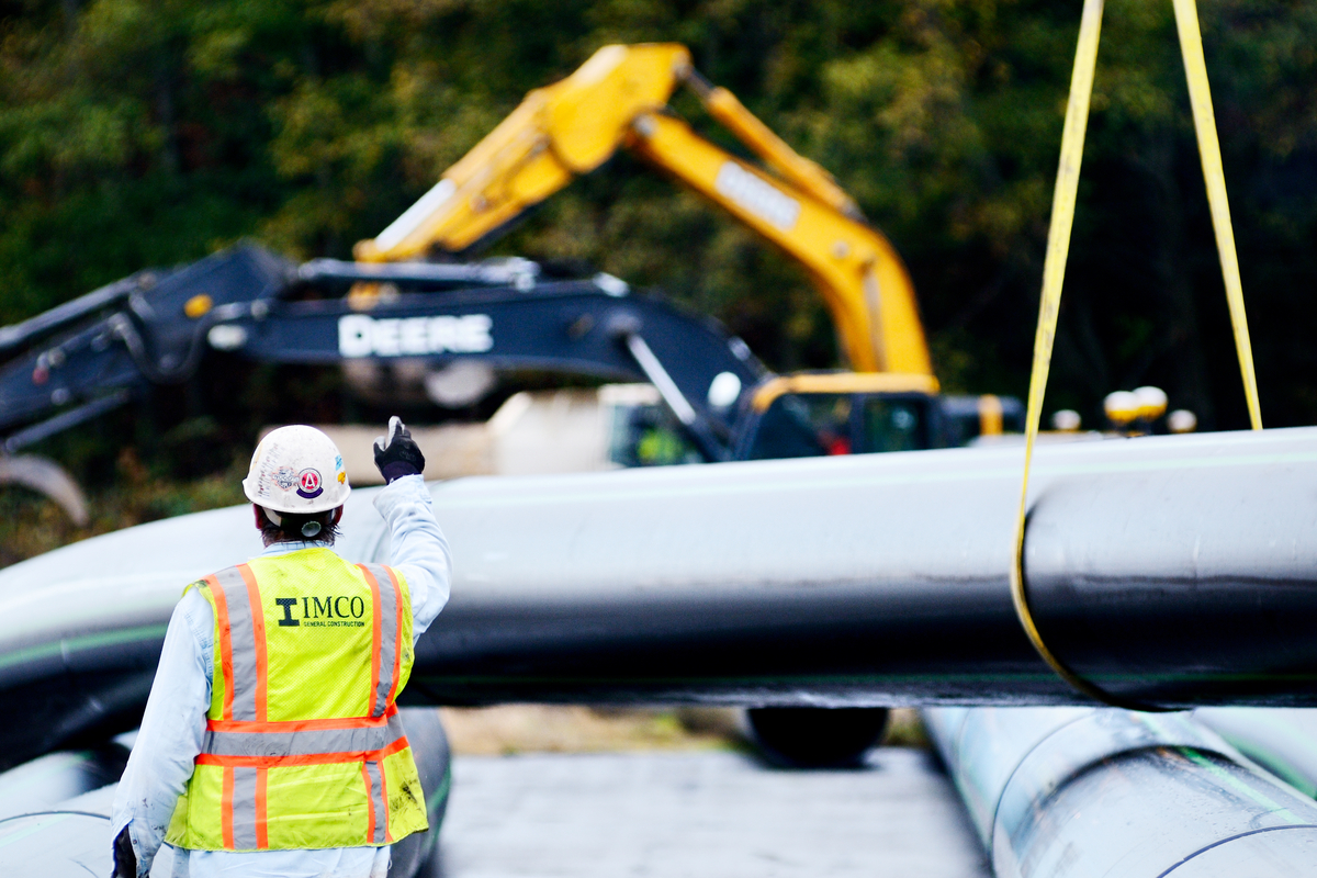 IMCO used innovative methods to reuse existing infrastructure in order to construct a new combined sewer overflow project for the City of Port Angeles. The Project was part of the City’s approved CSO Reduction program to increase storage capacity of combined sewer overflows to better protect the city against major rain events inundating the sewer system. This was the first phase of a two-phase project valued at over $40 Million and was the city’s largest public works construction project to date.This project included a diverse and complex scope of work, 85% of which IMCO self-performed. The project involved wastewater treatment plant modifications, a new bridge over Ennis Creek, sliplining, a five-million-gallon tank rehabilitation, and open-cut installation of nearly 35,000-feet of pipeline.Crews used the technique called sliplining to install nearly 17,000 feet of pipe. The slipline required simultaneous installation of one 30-inch and two 14-inch HDPE pipes pulled through an abandoned 48-inch industrial waterline. The pipeline parallels the Olympic Discovery Trail located within 10 feet of the Port Angeles shoreline. A major concern for IMCO’s client was the potential for typical open-cut construction methods to disturb native artifacts that may be in the area. There was also concern about the risk of environmental damage with open-cut excavations in close proximity to the shoreline. The solution was to slipline the existing waterline. The scale of the slipline made it particularly complex, with only a few inches of tolerance to fit the three new pipes through the existing pipeline. IMCO General Construction self-performed this scope, with support from Advanced Boring Specialists.The Olympic Discovery Trail goes right through the jobsite is on the course for the Boston Marathon qualifying race that takes place every May. IMCO was able to sequence and accelerate the work to meet the milestone dates. The Boston Marathon qualifies specific courses, so the race couldn’t take place without the course being restored to its original condition.The project also included the rehabilitation of a five-million-gallon steel tank that was part of the Rayonier Mill. The tank was previously used for industrial processing in the old pulp mill. The tank was being converted to CSO storage in order to avoid overwhelming the existing treatment plant. Innovative design by the City of Port Angeles allowed for the reuse of existing infrastructure, saving resources and protecting the marine environment.“There have been changes and challenges that could have de-railed the relationship, but the project team has been dedicated to maintaining a strong relationship. This is something we are very proud of,” said IMCO President, Tyler Kimberley.